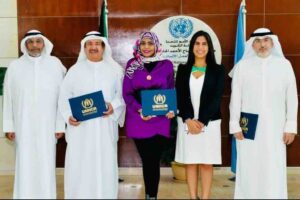 كرم مكتب المفوضية السامية للأمم المتحدة لشؤون اللاجئين في الكويت مبادرة أصدقاء المكتبة على المستوى العربي ممثلة برئيستها الكاتبة أمل الرندي، بعد النشاط الثقافي الإنساني الإبداعي الذي قامت به في اليم الأزرق للاجئين السوريين في الأردن.