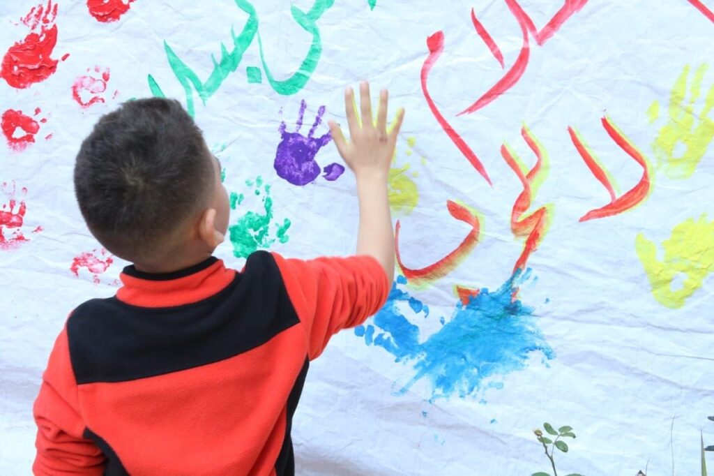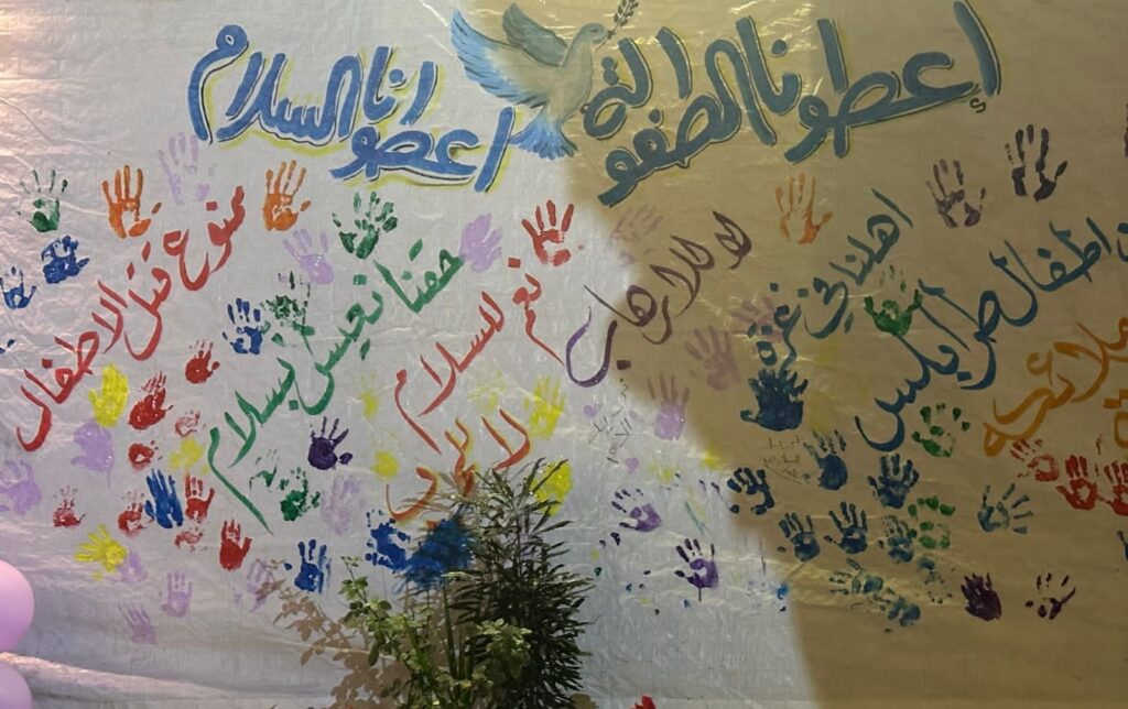 وناشدوا العالم مراعاة الطفولة مع تمنيّاتهم بالحريّة والسلام والأمان المفقود ووقعوا على يافطة كرسالة جماعيّة للعالم بمشاركة مدير مركز العزم الثقافيّ عبد الناصر ياسين .