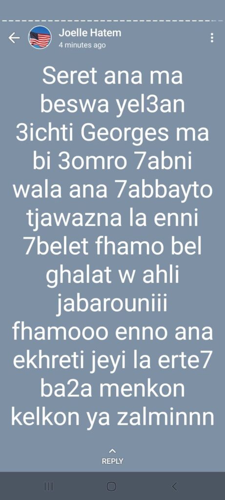 نشرت طليقة الفنان جورج الراسي السيدة جويل حاتم على خاصية واتساب تصريحات تقوم بها بشتم والدها وتحميله مسؤولية زواجها من الراسي لانها حملت منه.