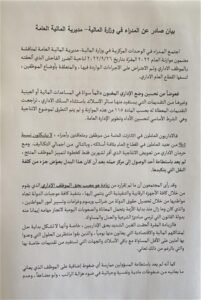 أعلن مدراء الوحدات المركزية في وزارة المالية – مديرية المالية العامة, في بيان, عن “حضور الموظفين يومين في الأسبوع الواحد ما بين الاثنين والخميس في ظل التوقف القسري عن العمل والظروف الحالية”.
