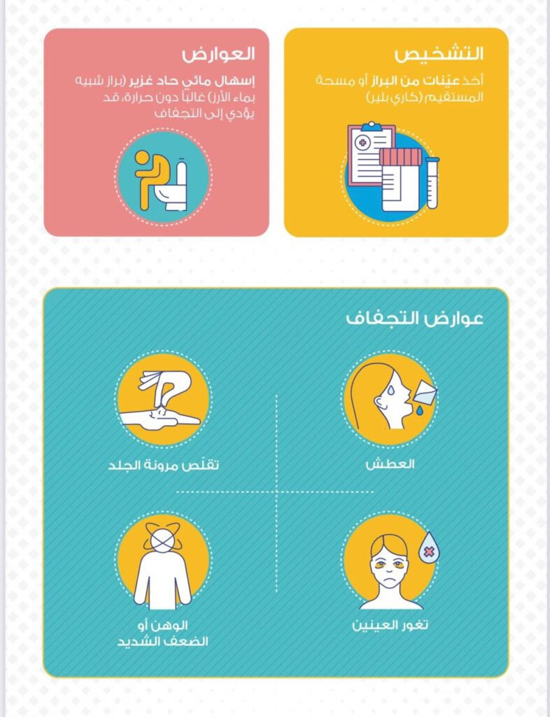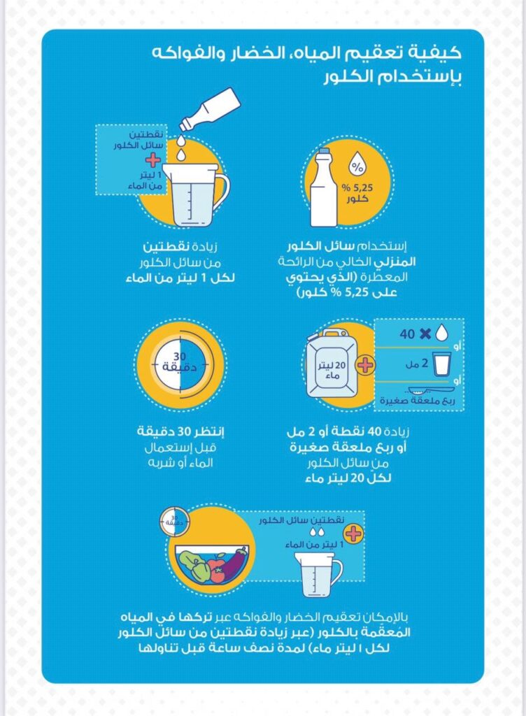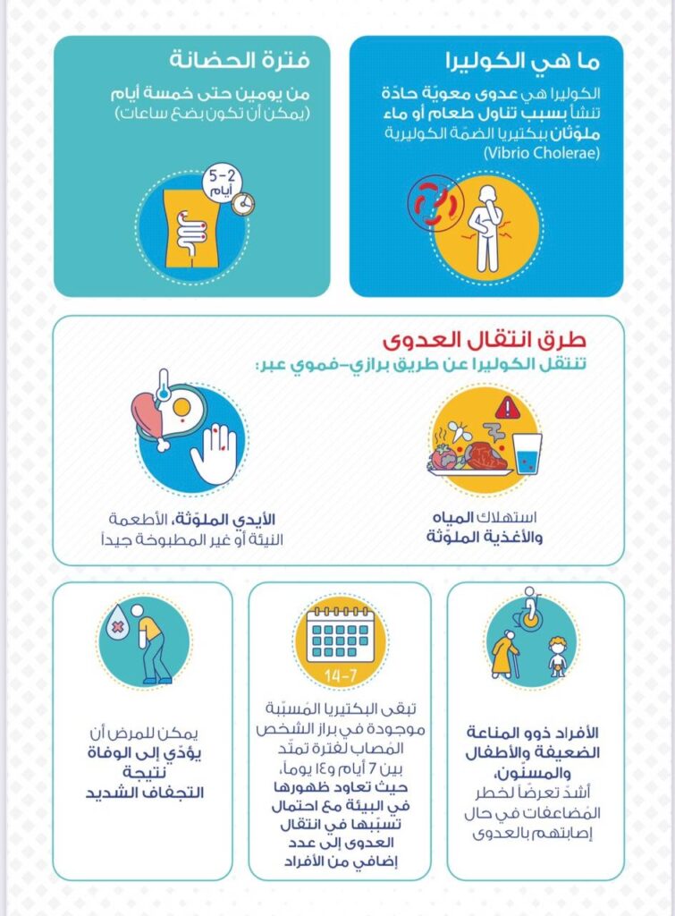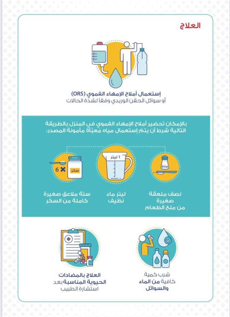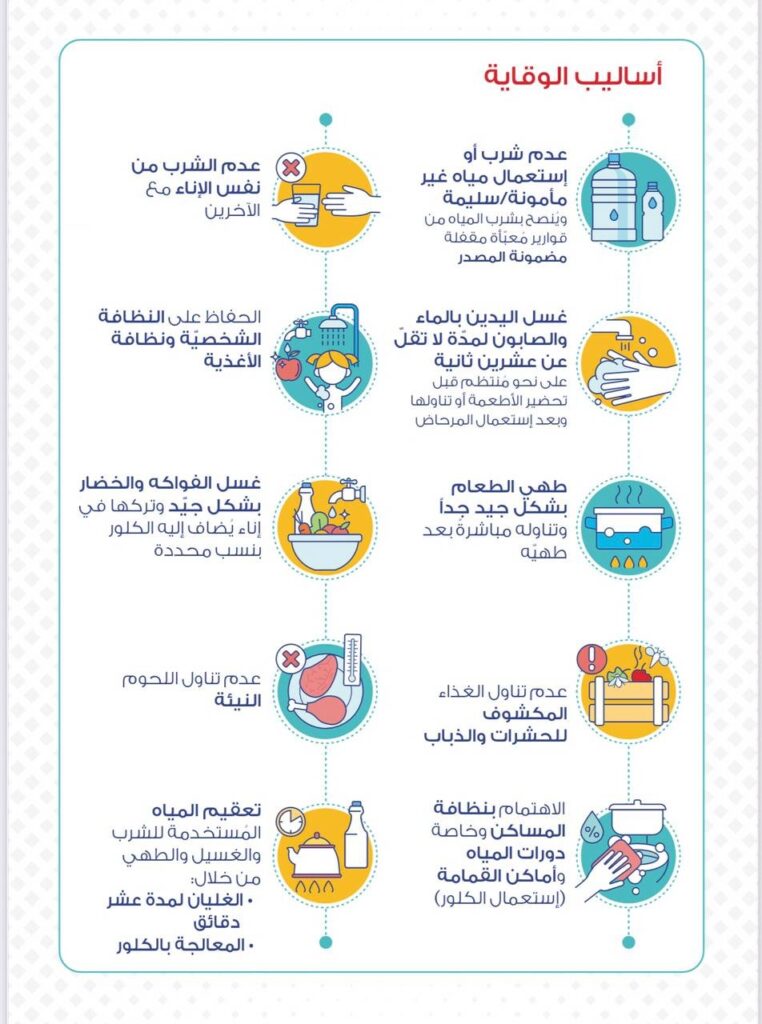 كذلك، قدمت الوزارة دليلاً بأساليب العلاج من الوباء في حال الاصابة به، إلى جانب سردٍ مفصل لكيفية غسل اليدين بشكلٍ جيد وتعقيم الفواكه والخضار قبل تناولهاوفي ما يلي الدليل الكامل الخاص بوباء الكواليرا: